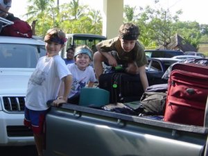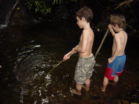 Anyhow. Nathan’s also exploring Kuna-run eco-tourism. As a test run, he’s invited a few friends, supporters, and travel writers to participate in an experiment: kayaking the Mamoni River through Kuna land, from continental divide to coast. Being Panama, the trip is only about35 miles, but apparently, the river’s never been navigated end-to-end, and Colin and family were invited along for the expedition. Colin’s wife and kids (a.k.a. “the boy cousins”) wouldn’t be kayaking, but would spend the week poking around, swimming in waterfall-fed pools, chasing (being chased by?) the local flora and fauna.