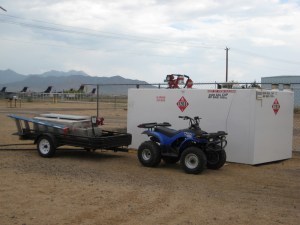 They taxi up just as I’m settling in to start writing my own, and Bob asks me to fuel ’79H for our own morning prep while he runs into town on an errand. I’ve never fueled a plane here, so I ask Danielle at the front desk what the protocol is. They’ve got an ATV tug pulling a trailer tank; I’ve not been briefed on how to operate it, but she tells me “It’s pretty straightforward – call me if you have any problem with it.” Uhhh, okay…