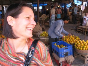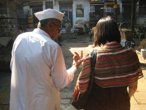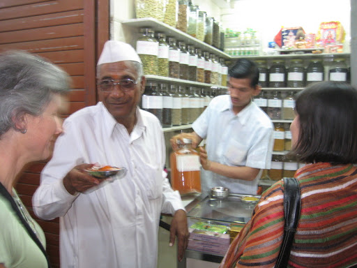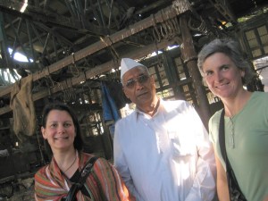 Mumbadevi was a swirling mass of people, color, sounds and scents. We were pretty well lost and confused. After wandering a few minutes, overheard an English voice explaining something pedagogical, and angled in to listen. Turns out it was Katherine (Catharine, Kathryn?) Meyers (Miers, Meiers?) from Univesity of Connecticut (Conneti… oh, never mind) and her foreign study students. She briefed us on the process of how to buy an offering, where to take our shoes off, etc., and off we went. Temple drums pounding, bells jingling as somber silent priests held out sooty lamps for the faithful to hold their hands over. After we gave our offerings, we were each dabbed on the forehead with the little red smudge indicating that we’d been properly blessed, and sent on our way. Great fun and confusion for us, but as indicated above, no pictures.