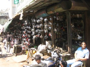 From there, northward, lost, wandering through the steel-pot market, the flower market – wreaths, leis, and bee-laden bowls of exotic blooms, the “wet and dry” market – full of frankincense and myrrth. Down backstreets past the block where painters and plumbers sat curbside, brushes in hand, waiting for customers. The auto parts market, where vendors engaged in bewildering specialties (we stumbled across the “car horn vendor” with car and scooter horns hanging, mobile-like from shoprfront; I suspect that shutting him down would singlehandedly reduce the noise pollution in Mumbai an appreciable amount).