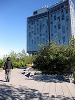 I would love to write about our hotel too; the Standard Hotel is funky and fabulous in the same way that WD 50 is. Okay, maybe not quite as funky – it would have to have bellhops emerging from secret panels in the ceiling to be in the running there. But the neuromorphic decor of the lobby, and Dante-esque video that slowly scrolls down the wall-mounted video screens in the elevator definitely scream “funky”. In a I-think-that’s-the-kind-of-funky-I’m-okay-with sense of the word. The hotel itself straddles the High Line on two big pylons, and towers 18 stories above it with ceiling to floor windows (the welcome packet reminds guests that when the windows work both ways and asks guests to be discreet in consideration of park-goers. A Google image search for pictures of the hotel instead turned up a trove of photos park-going photographers have taken of guests who have not heeded the hotel’s warning).