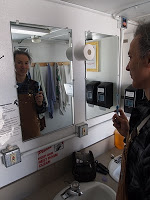 Ah yes – “the whole time”. We’re limited to two 2-minute showers each week. There’s no policing – it’s all honor system. I’ve heard the process called a “Navy shower”: blast on the hot water for 30 seconds to enjoy the sensation of getting soaked, and turn off the water. Lather up, turn the water on again, and rinse. Plenty of time, really, even for folks like me who have long hair that needs to be washed (the “2 minute” limit is 2 minutes of water – you spend as long as you want in the stalls).