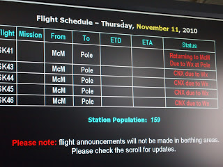 Once out the door however (dropped my mittens, banged my head and backpack on the corridor, forgot my towel), it was a glorious morning. Hard to tell it was morning, of course, since the sun was just over thataway instead of thisaway. But the wind had died down completely, the endless silent snow glistened, and a half moon hung over the station. Even though the temperature had dropped back to about -39C, without the wind, the walk to station felt lovely.