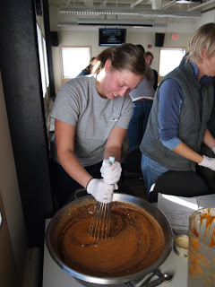 Bunch of us gathered last night in the galley to make pies for T-day. Apple, pumpkin and pecan. Not clear to me that it was all that much of a labor saving for the galley crew; I think it was more of a community-building exercise. Great fun, though, to prep food in industrial proportions: pumpkin recipe called for “5 1/2 cups of eggs, 6 pounds of milk”….
