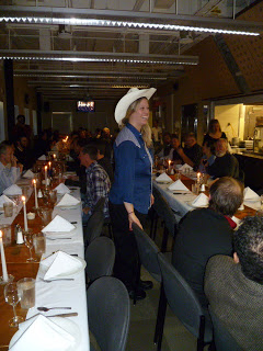 As the first, 3:30 afternoon dinner seating approached, the halls filled with folks scurrying around with garment bags, looking for ironing boards, primping and complementing each other on “how well you clean up”. Getting dressed up here is a big thing. No tuxes, but an surprising number of “little black dresses” came out of nowhere, along with a handful of alarmingly bright ties and one full-tilt Scottish kilt. Others went for less conventional gear. Most notable was Isaac, in what appeared to be gold-lame lederhosen, cardboard wings, a utility belt and nothing else. Lots of the men shaved for the first time on station. Martin, our station manager even took off his hat (sadly, no one recognized him).