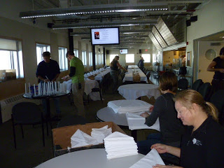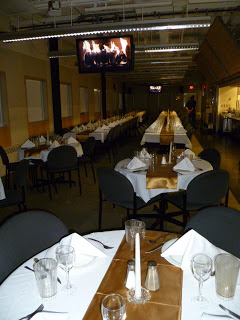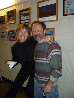 What a strange place to play: set up in the hallway, with me on the right, Mark and Daniel on the left, and a constant stream of people filtering through between us while we sang. I had to keep swinging my guitar out of the way so folks could get through. At a few points, somewhat-inebriated passersby threading the gap found themselves face-to-face with a microphone (*my* microphone) and decided to stop where they were and sing along. But it was fun.