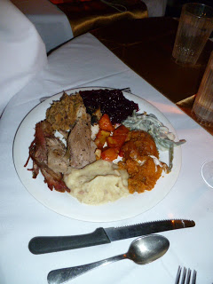 Dinner. Was. Fabulous. Smoked turkey, deep fried turkey. Two kinds of stuffing, mashed potatoes and baked yams, fresh-baked biscuits and graaaaaavy. Oh, and pie. And more pie. With whipped cream and caramel sauce.