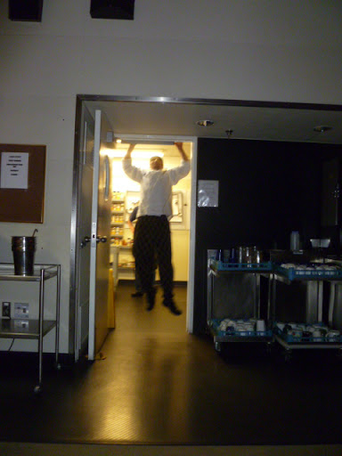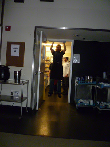 As the first, 3:30 afternoon dinner seating approached, the halls filled with folks scurrying around with garment bags, looking for ironing boards, primping and complementing each other on “how well you clean up”. Getting dressed up here is a big thing. No tuxes, but an surprising number of “little black dresses” came out of nowhere, along with a handful of alarmingly bright ties and one full-tilt Scottish kilt. Others went for less conventional gear. Most notable was Isaac, in what appeared to be gold-lame lederhosen, cardboard wings, a utility belt and nothing else. Lots of the men shaved for the first time on station. Martin, our station manager even took off his hat (sadly, no one recognized him).