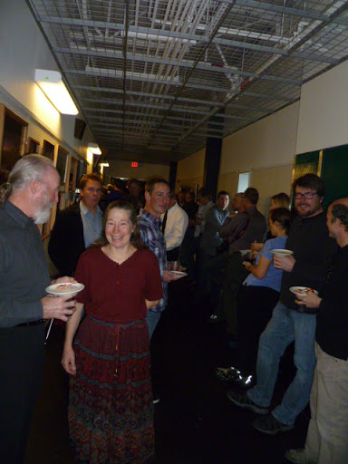 What a strange place to play: set up in the hallway, with me on the right, Mark and Daniel on the left, and a constant stream of people filtering through between us while we sang. I had to keep swinging my guitar out of the way so folks could get through. At a few points, somewhat-inebriated passersby threading the gap found themselves face-to-face with a microphone (*my* microphone) and decided to stop where they were and sing along. But it was fun.