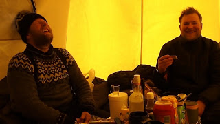 When I turned, I noticed that Kyle had disappeared. A few moments later, a head in a fur hat poked out of one of the tents, waved me over with a vaguely conspiratorial look, and disappeared back inside. I ducked my head in and found Kyle sitting with Gisli, Gummi and Felicity on benches around a campstove and veritable smorgasbord of snackables. They gestured me to join them and handed me a shot glass of vodka to join them in a toast the moment I’d planted my posterior.
