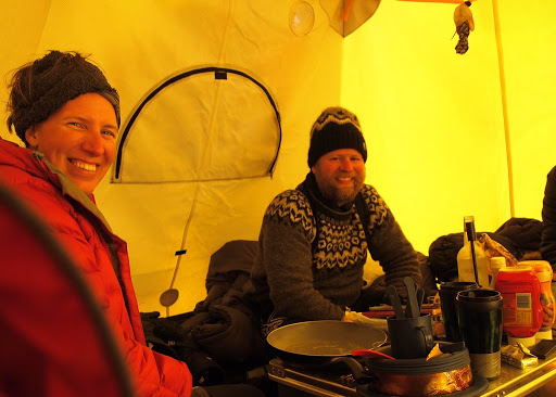 When I turned, I noticed that Kyle had disappeared. A few moments later, a head in a fur hat poked out of one of the tents, waved me over with a vaguely conspiratorial look, and disappeared back inside. I ducked my head in and found Kyle sitting with Gisli, Gummi and Felicity on benches around a campstove and veritable smorgasbord of snackables. They gestured me to join them and handed me a shot glass of vodka to join them in a toast the moment I’d planted my posterior.