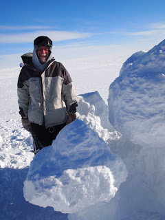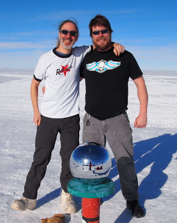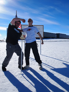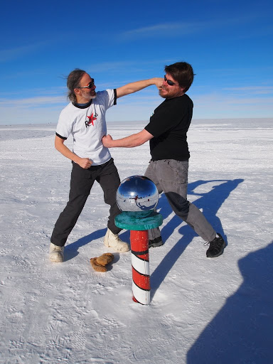 A couple of days ago, Eric-from-the-10-meter-telescope and I went out to the Pole for a photo shoot. A month ago we’d crossed paths in the galley and noticed that I was wearing my Rocky Mountain Roller Girls (yay!) shirt while he was wearing a t-shirt from the rival Windy City Rollers. We knew immediately that we’d have to stage and photograph a brawl defending the honor of our respective teams. Hannah, Charlotte – I’ll be sending you the full-res versions by email, and if anyone asks, yes, I sent Eric packing. There was only enough room at the Pole for one roller derby team, uh, fan. (Okay, in the spirit of full disclosure, Eric was already scheduled to depart Pole that morning, and if he hadn’t been so good-natured, he could have torn me into Happy-Meal-sized bits and distributed me to schoolchildren to feed to the animals in the Christchurch Zoo.)