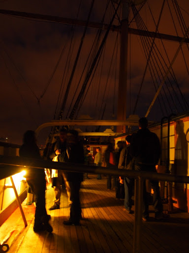 Anyhow, nowadays, you get about 80-100 people showing up at the park gate in the dark, hours after the park has closed and saying the magic word. They’re admitted, handed a little “raffle ticket” stub, and directed to the Balclutha, at the end of the pier.