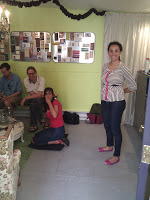 Honestly, it didn’t take that much courage to wander down to the end of the land and peer my head in, but I wasn’t prepared for what I saw when I looked. It was indeed a garage, but with a brightly-painted interior covered with wrappers from hundreds of exotic chocolates from around the world. A low, broad table was set in the middle, tiled with trays and plates, each stacked with broken squares of a dozen different shades of brown and black delights, around which half a dozen people of all ages were seated on chairs and cushions, chatting happily as though in the middle of a private tea party. A woman in pink slippers was just bringing another tray to the table.