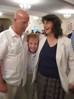 Then the music starts up again, and the guys over in the center of the room need help doing the “lift kids on the chair and dance around with them” thing. Yes, traditionally that’s what you do with bride and groom at a Jewish wedding. Traditionally. But the kids are squealing to be lifted up and danced around with, and “tradition”? Remember the bit about the bat-mitzvah-in-a-Buddhist-temple. The whole thing is a cultural analog of molecular gastronomy, where, if you do it right, you can take an eclectic collection of highly improbable – even instinctively incompatible – ingredients that have come together in a way that, well, just works. Well, Mary and Fred have done this right, and it’s working – it’s working wonderfully. Even if, somewhere far overhead in low earth orbit, a pot of petunias is about to have a bad day (Read the books, okay? Just read the books).