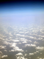 I huddle my black fleece over my head as a shield and lean forward, inching the porthole open an inch at a time. Outside, beyond the blinding brightness there is no land – only sky and a flat sea of cloud below us.