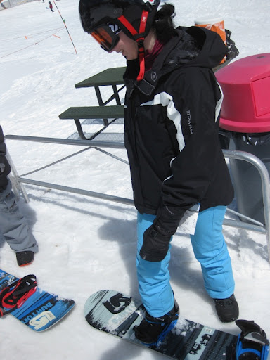But that’s tomorrow. Today? Today was a good day. Kids both damn near knocked themselves out getting the most out of their last day on snow until next season. Jem always seems to make progress in punctuated equilibrium, and today he “got” the knees and ankles thing: knees bent to keep the weight forward, ankles as close as comfortable for the steepness of the slope. Everything else just fell into place – posture, fall line, the works. Devon and I had a hell of a time keeping up, and he wasn’t just doing the A-frame bomber routine – he was just cruising through the turns, blam, blam blam, all the way down like an Energizer bunny. Didn’t matter whether it was one of the light blue slopes at the base or one of the black diamonds down the back, he just, well, he just skied it: blam, blam, blam. And when we finally caught up with him at the bottom each time (staggering and breathless), he asked: “Can we do that one again? Can we? Can we?” We’ve definitely reached the when-you-can-snatch-the-pebble-from-my-hand point. Next season, we need to find him a ski buddy he won’t run into the ground.