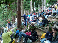There was home-made tandoori chicken, sliced cucumbers, cherries and apricots. Fresh bread. And (not surprisingly) there was pie. There was a bottle of wine to be passed around. And there was a sea of humanity, spread out on the lawn below, perched beside us on the ledges, and disappearing up into the woods above us.