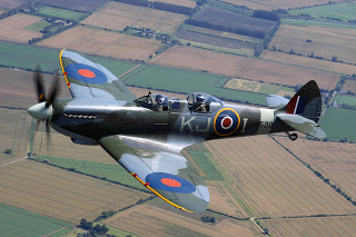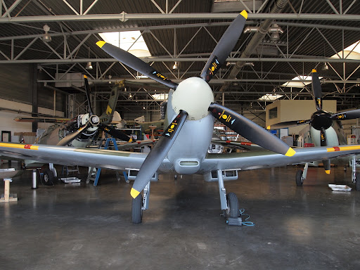 Then it was out into the open air of another gorgeous summer day. More wingovers, and I finally got the victory roll right. Al demonstrated a “PFL” – practice forced landing, cutting the throttle back to idle at 3000′ and spiraling us down disturbingly close to one of those picturesque English fields before blasting in 6″ of boost (that’s 36″ of MP at 2800 rpm, swinging four blades of a 10′ 9″ prop, for you pilotfolk keeping track of numbers). We climbed away over the hamlet rooftops in a – ahem, living legacy – clatter of pistons, and it was my turn. I overshot badly *and* let my speed get to high. I called it early, and Al was unconcerned (“No worries – find another field.”) but I’d painted myself into a corner of furrows and powerlines, so we added throttle in and clattered skyward again. Somewhere along the way – I think it was back in the pattern at Duxford, Al offered more advice about forced landings and field selection – there was something at the end about the farmer’s daughter, most of it pertained to controlling the impact with terra firma.