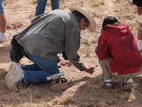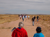 We’ve been warned not to pick anything up – as well as not to eat or anything (or apply cosmetics – little danger there) while on the site. Plenty of folks are wandering around though, saying “Hey honey, look what I found!” while waving a chunk of something. Some of the old-timers are poking through the dirt, Geiger counters in hand, exchanging stories of the old days at White Sands. Jeremy befriends one of them and gets a lesson in something or another. These folks have plenty of tales to tell, and Jem’s all ears today. He’s at Ground Zero of Trinity – practically heaven for him.