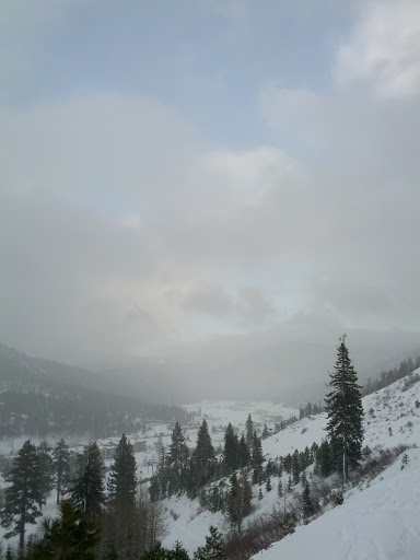 It felt a little improper to be here, skiing on a Friday while everyone else was at work. But that was the whole point of taking time off. And besides, I’d justified it to Devon as research: we’d discovered the Bay Area Ski Bus online, and someone had to check it out. It sounded like a great deal: you get up insanely early (~4:00 in my case) and drive to an abandoned parking lot somewhere. Climb aboard the darkened bus, find an empty seat, put on your eye mask and ear plugs, and drift back to sleep. Wake up somewhere else, a few hours later, climb out and ski. Make it back to the bus by 4:30, and either sleep or watch whatever movies they’ve got going on the overhead screens. Be thankful that you’re not the one driving through the frozen, slush, chainslogged mess of traffic. Watch another movie. Make it back home by, oh, 10:00 and crawl back into bed, happy and exhausted.Or, at least, that was the theory. But there was no way we were going to subject the kids to it until one of us had made sure that the whole thing actually worked. And it did, mostly.