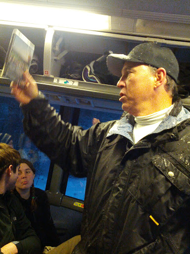 Back at the bus, Christina and Jim had set out an après-ski spread of cookies, hot cocoa and cider to re-invigorate us for the trip home. The snow was still falling heavily (note to self: Oreos topped with a quarter inch of fresh snow are a novel and surprisingly tasty sensation), and there was a sense of urgency about getting on the road and over Donner before weather closed the pass for the night.