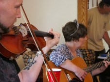 Seems like everyone plays something, or sings. Jan took up banjo just this year, and she trades chords with Jason (on fiddle) in exchange for tips on clawhammer technique. Kids out front have discovered as-yet-unchalked portions of the sidewalk and stake out squares for their next creation.