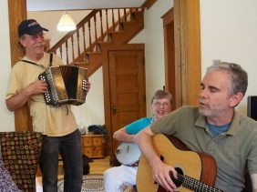 I’m usually pretty useless at smalltalk – either I talk too much, too long about things no one cares about that much, or I stand there listening, nodding my head, trying to be polite after having lost the thread of narrative. But these people? They’ve got wonderful stories. And, when, a couple of hours into the gathering, someone picks up a guitar, the music just flows. There’s blues and Beatles, Irish ballads and fiddle tunes. Gamelan bells (itty bitty ones) and bongos. And – later in the evening – a Theremin solo by Tad, Ellen’s wonderful and musically versatile partner.
