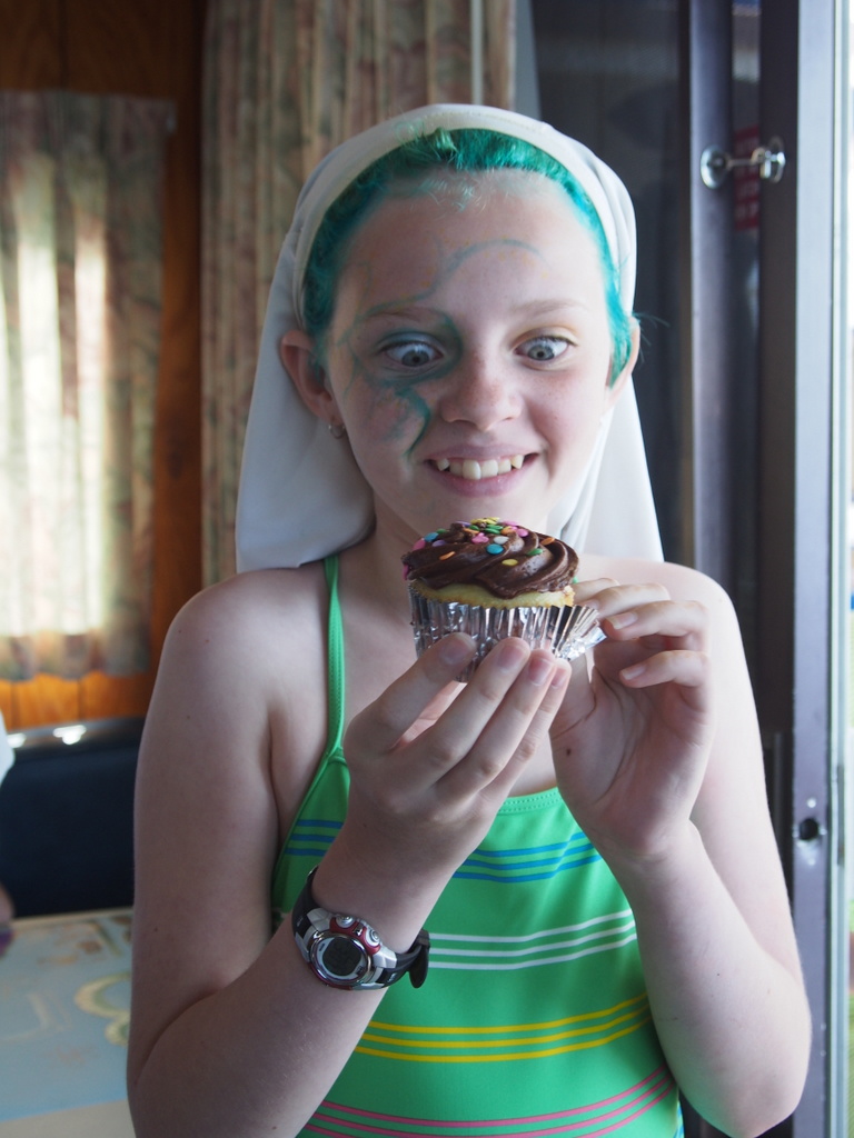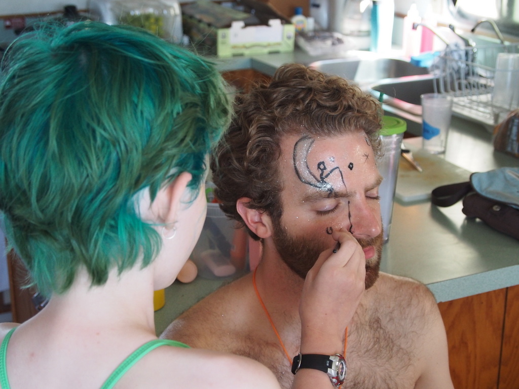 But that all tends to reach crescendo on the weekend, especially Saturday night. Today, Thursday, things are still mellow. Folks are mostly wandering boat to boat, reintroducing themselves to old friends, making new ones. Art is being put together and lifted up onto the roofs. Faces and feet are being painted. In fact, I’ve mis-spoken about not having brought anything to give: Cymbre’s remarkable face paintings have made Breeder a bit of a surprise social hub. She’s painted sunrises, unicorns, glittering silver moonscapes, spider webs and Seuss-worthy creatures on the cheeks of any passerby brave and willing enough to sit still for her. And there have been other surprises, too, all good so far. The Vogon poetry slam and impromptu pie-fest on Mostly Harmless. Pets – two dogs and a parrot over on Titan, and those improbable small world connections and reactions that seem to happen anytime you get a sufficiently large number of sufficiently interesting people together in a sufficiently interesting setting. And this is, indisputably, an interesting setting.