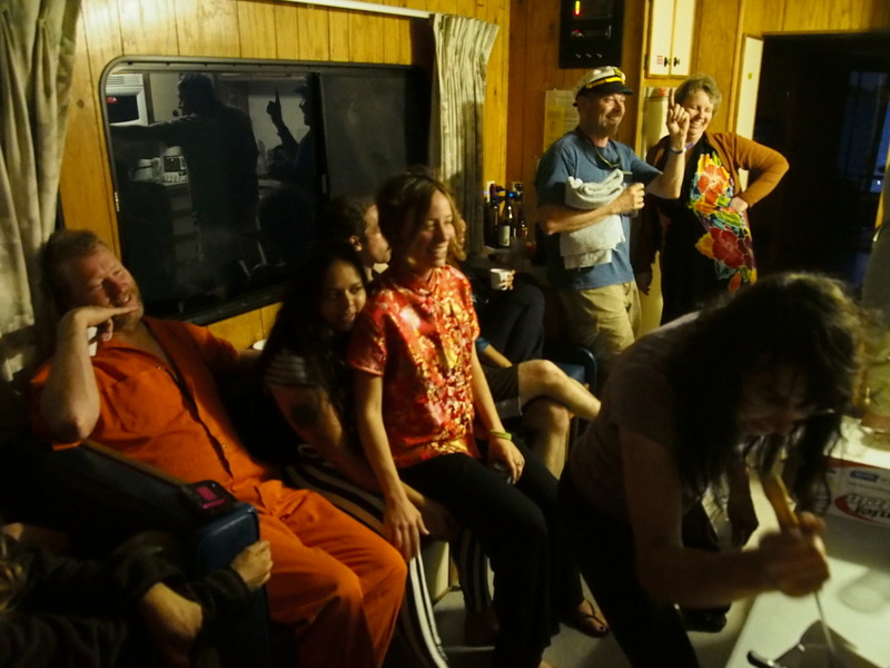 Crasch, Karen and others have returned from H&H Marina, where they assembled “The platform” and towed it to the inside corner of Dromhaven’s “L”. A dozen people – kids, grownups are dancing tentatively on the flexing, bobbing plywood deck, trying to match beat with Kelly’s mashup mix while not trampolining each other into the water. Another campfire sing has broken out in Mostly Harmless, and at the end of the island, on Lovecraft, Peter and Erin are doing LED poi demonstrations.