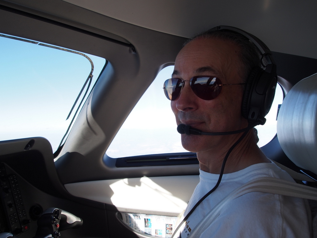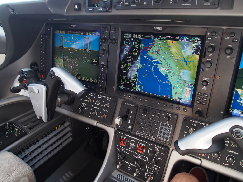 I’ve got to say: the level of digital automation in this plane is spectacular – three enormous screens and an flight computer that would make HAL blush. It measures and integrates the weight of fuel in each tank, then spits out appropriate V-speeds for the temperature and elevation of the current field. The flight director – with synthetic vision – shows you precisely where to point the nose for every stage of flight, or does it all for you if you tap the “autopilot” button at top center of the panel. Phenomenal automation.