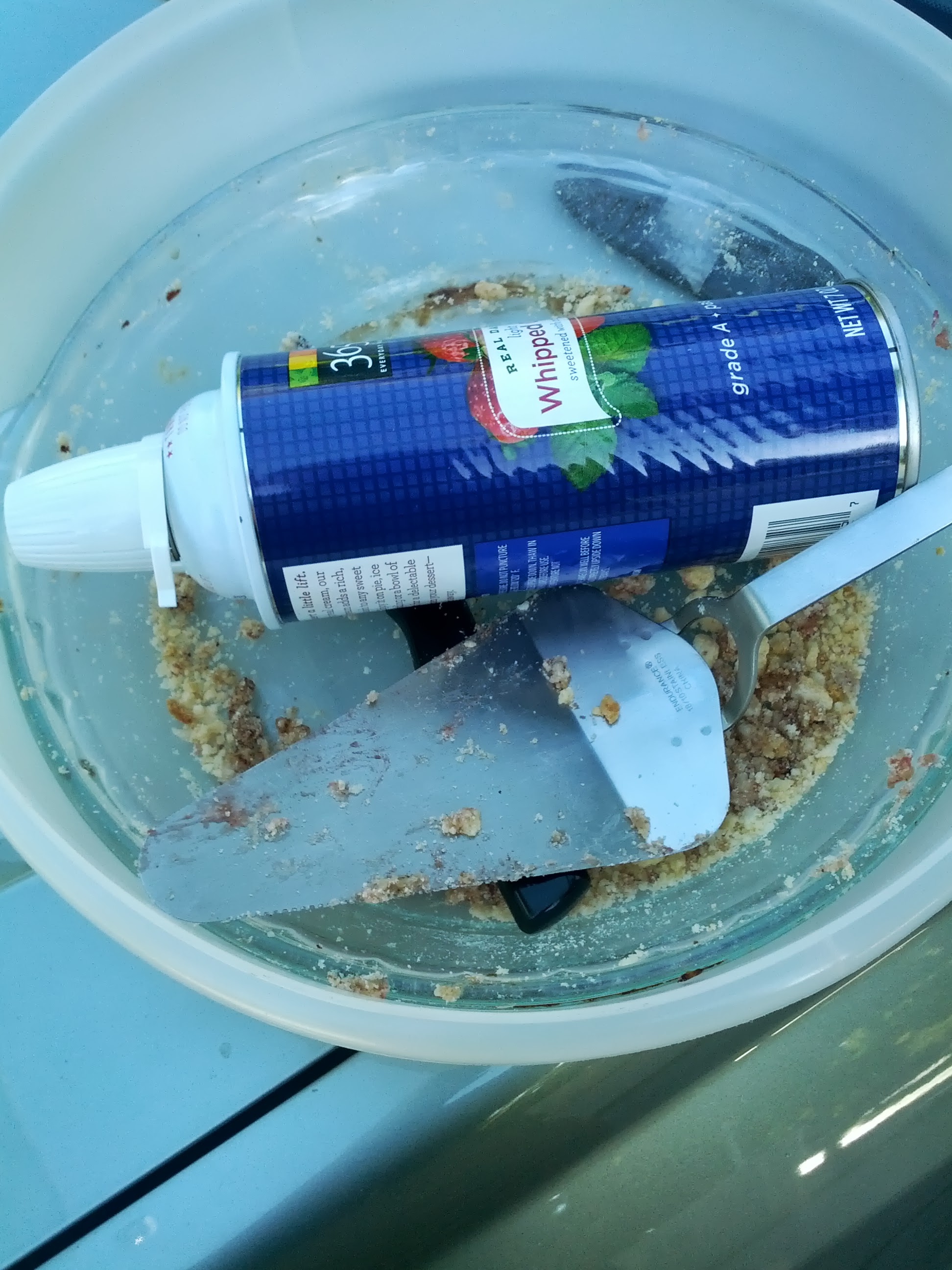 Why was I telling you this? Oh yeah – the pie. It was kind of how I felt bringing the disaster pie in to the office. Everyone gathered around and had a slice. Said it was lovely, just wonderful, but honestly, I wanted to check whether the “all purpose gluten-free flour” really did list sawdust somewhere on the ingredient list. And tellingly, those of us who were not lactose intolerant weren’t shy about loading our slices up from the can of spray-on whipped cream I’d brought along. As always, chance favors the prepared.