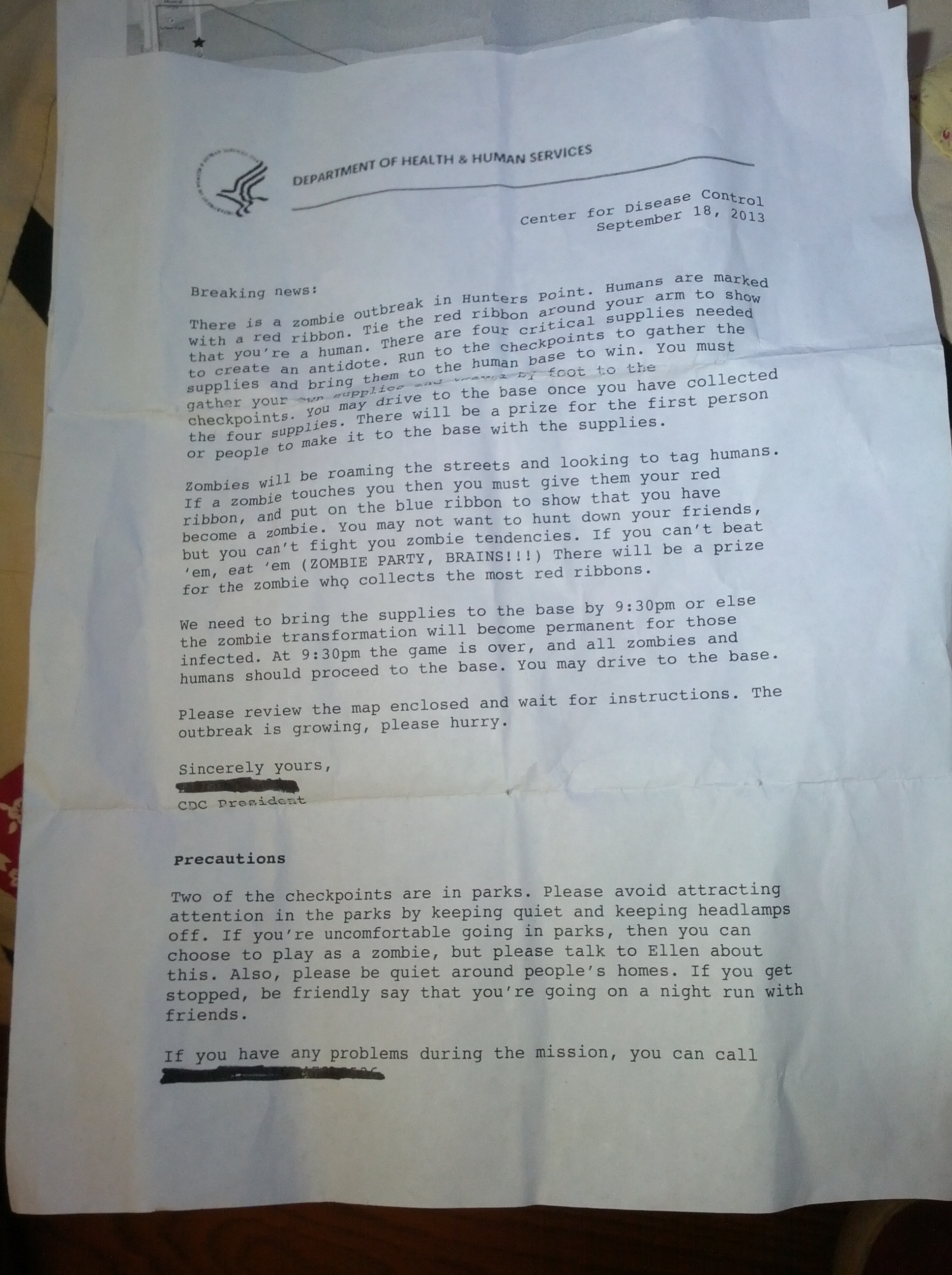 I was trying to explain this to Daniel and Paul as we wove our way between shadows on Cargo Street, trying to make it to the other end of this darkened industrial construction zone. Our goal was a single-lane bridge where we hoped to find one of the four critical supplies that the CDC needed to to create an antidote. I was explaining to Daniel and Paul why at this particular moment I was Not Having Fun. Why it was not what I had in mind when I said yes to the mysterious invitation reading “Sept 18th. Arrive by 7:30 at 1195 Evans. Bring ID, smartphone, bathing suit and a headlamp. Wear clothes you can move in and get sweaty in.” Nothing in the invitation said “Zombie Apocalypse”.