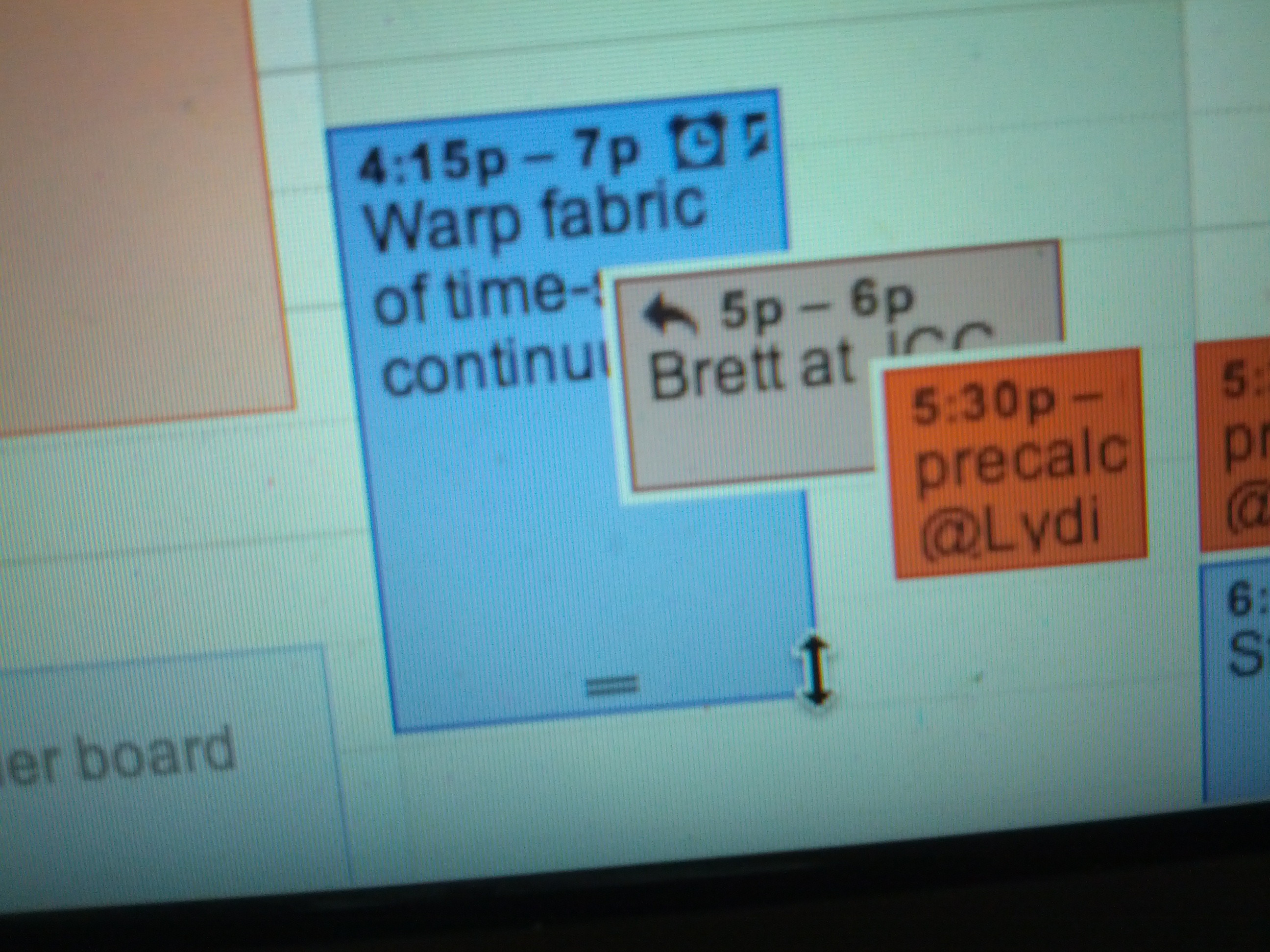 Regardless – we’re all going to survive, if only because Devon’s getting back tomorrow afternoon. And because my sole remaining challenge (besides feeding the kids tonight and getting them both to school tomorrow morning with proper clothing) is twisting the fabric of the time-space continuum to deliver Miranda to a 5:30 appointment in Menlo Park tonight while I’m busy with Jem from 5:00-6:00 in Mountain View. Piece of cake. Needless to say, we’re ordering pizza for dinner.