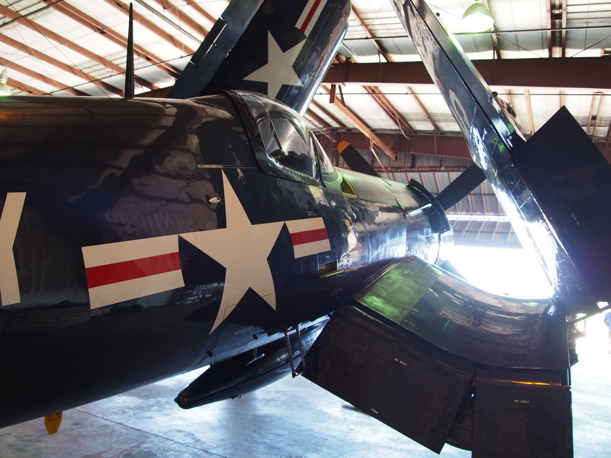 Afternoon? Well, we finally got to head over the the airfield and spend some time with the big pieces of metal in question. The hangar itself was what the aviation corner of Santa’s workshop must look like – a Corsair and TBM tucked in the corner, pieces of F-86 and TF-51 gleaming in partial assembly, and probably an acre of other projects underway.