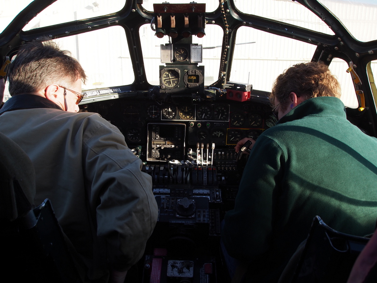 Betty Jane (the P-51 I flew last summer) was getting some touch up paint when we arrived, so I made a beeline to Nine-O-Nine, the Collings B-17 – after a day of diagrams and Powerpoint slides, I was eager to see what the front office really looked like. Holy cow. It wasn’t the proverbial “fist full of throttles” we always talk about – it was three or four fist fulls. I sat myself down in the right seat and Jeff, the crew chief for the plane, kindly took a few minutes out of the work they were doing to brief me on what the systems looked like in the flesh, er, steel. Ah, that’s where the chip detector lights are – no, I never would have found them on my own. Tail wheel lock? Better disguised than I would have guessed.