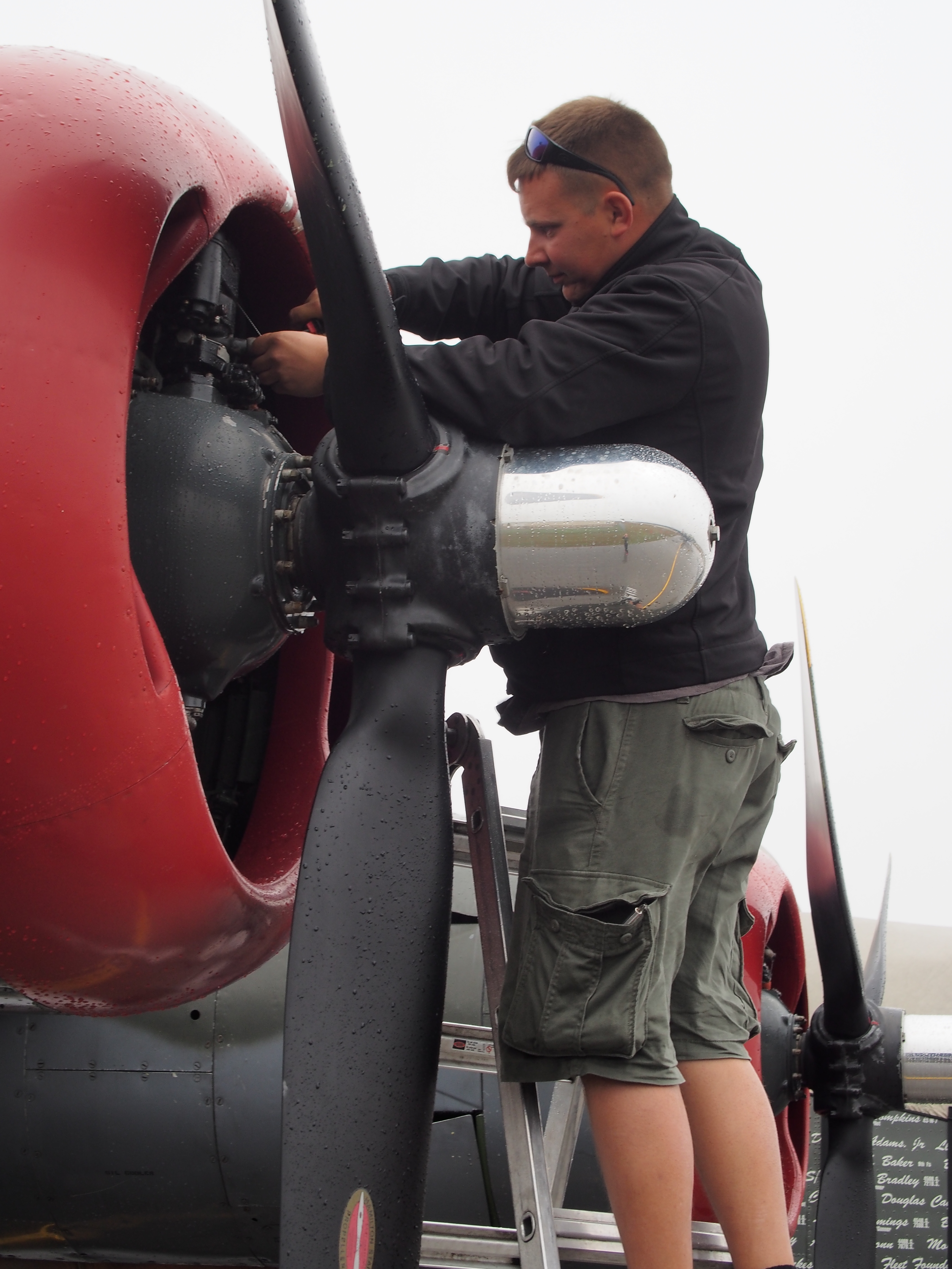 Witchcraft – the B-24 – came in half an hour behind us; she’d done one paying ride up at Sarasota before following us south. As usual, Mike, a.k.a. Mike-the-Russian, a.k.a. “Boris”* stood half out of the top hatch as flight engineer, watching wingtips and relaying his interpretation of the ground marshal’s taxi directions to Carl. He was getting soaked, but you know there’s no place in the world he’d rather be.