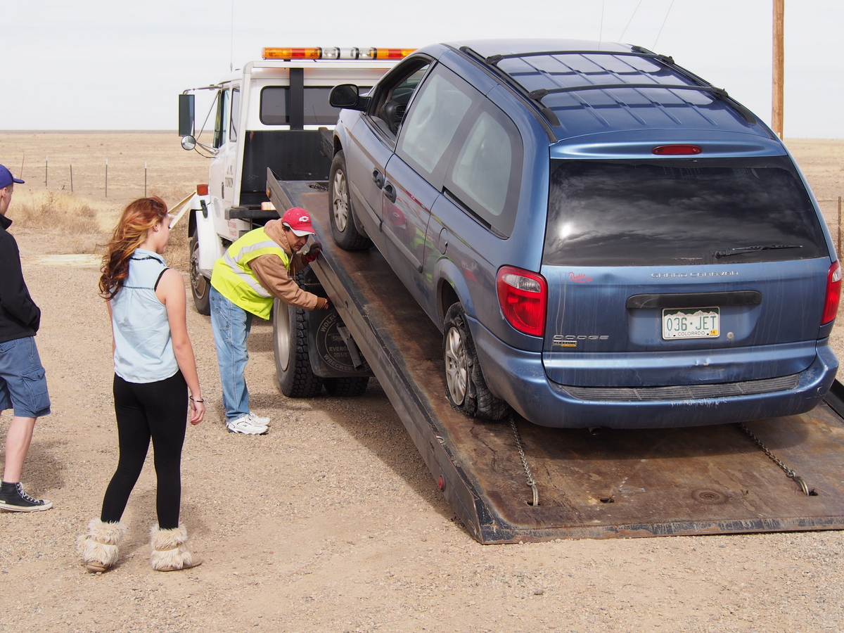 We pulled into a crossroad turnout near a row of mailboxes on the most desolate bit of Highway 10 East you could envision to examine the damage. Probably about 3/4 of what used to be the tire still remained attached to the rim (nope, this isn’t going to be a simple patch job), and for reasons that are best left alone, we were without a functioning spare. Fortunately, we had cell coverage and – more importantly – AAA coverage. Turns out that being on the road for the newspaper all the time had spurred Brian and Gretchen to sign up for the “extended coverage plan”, which gave them towing benefits extending out to somewhere near the Kansas border, if we happened to be so unfortunate. We made a few calls and were assured that Johnnie from J.M. Tire was on his way to rescue us. Even better (since Johnnie was technically only on his way out to rescue the van), Gretchen’s sister-in-law Debbie had dropped everything and borrowed a sufficiently enormous car to actually retrieve us, the van’s occupants. All we had to do was wait around a little and keep ourselves entertained for the hour or so until they could make it out.