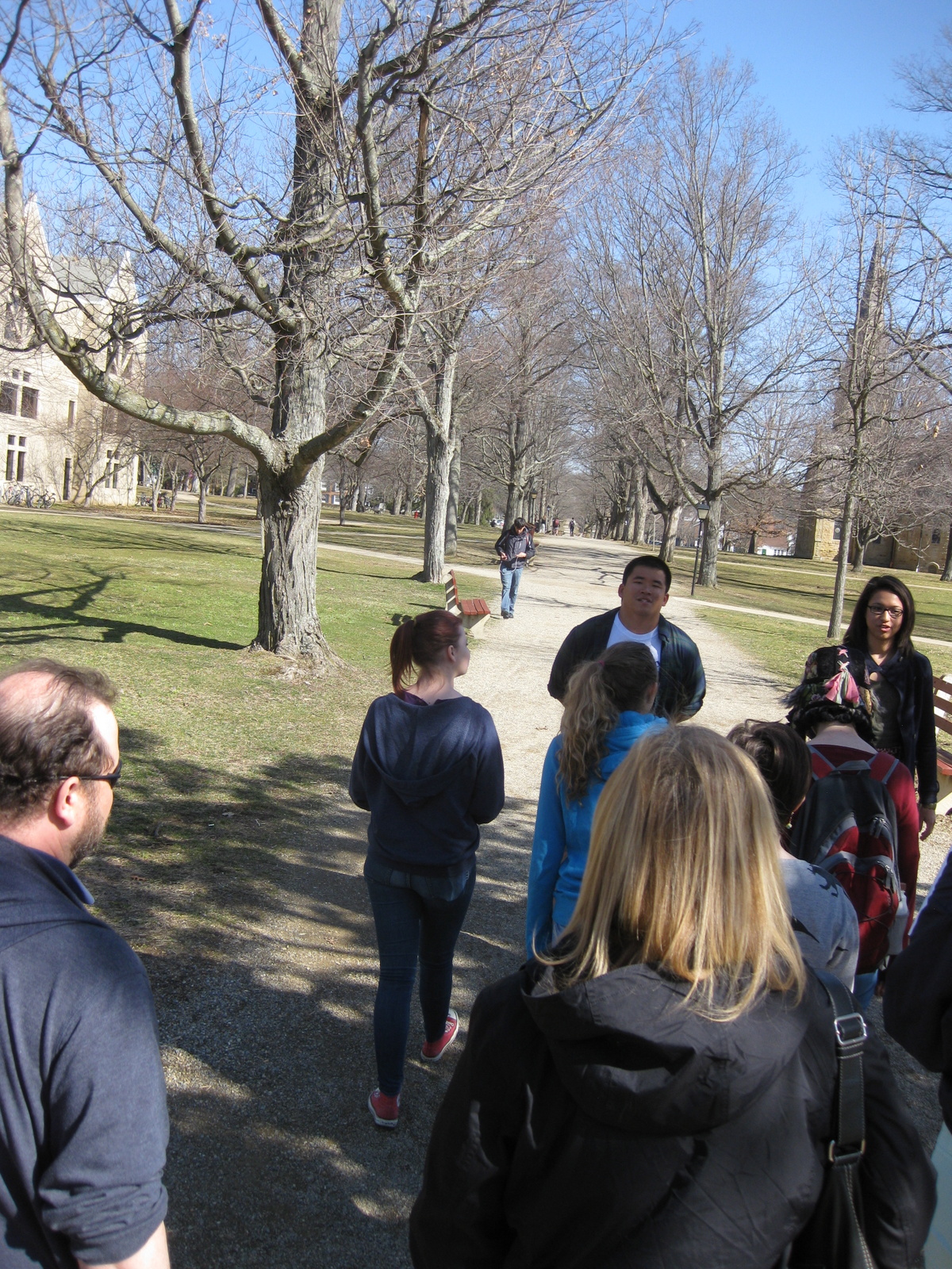 I’ve been here only once before, almost 30 years ago, but poor, patient Miranda has to put up with me pointing and ooh’ing and ahh’ing like we’d just arrived back at my long lost alma mater. They’ve got a lovely campus and here and apparently spring arrived on our heels and let herself in while we were doing our paperwork. Yes, there was still snow and ice and mud on the ground, but by the time we stepped out of the Admissions building for our tour, the sun was warm, and Kenyonites were in full frolic.