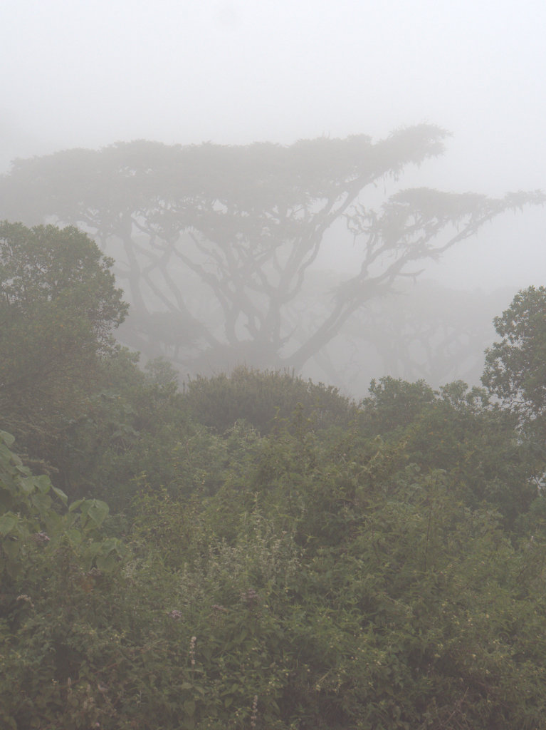 The dirt is red and moist, covered in lush green as we wind our way up to the rim of the Ngorongoro Crater. At the top is a cloud forest, a tropical tangle ringing the caldera floor half a mile below. Inside, it might as well be The Land that Time Forgot.