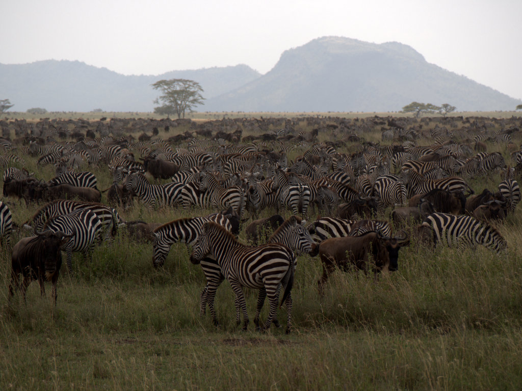 Then north and west into the Serengeti Park, which could have been Nebraska, or Kansas in the spring, where we ran smack dab into the southern contingent of the Great Migration. For those of you not up on your Nature Channel, the Great Migration is a sea of wildebeest, zebra, impala, buffalo and more – millions of them – moving together at the end of the rainy season (followed, predictably, by everyone’s favorite predators). It’s the sort of stuff that, I’m told, boggles the imagination and defies description. What we found today were mere thousands of animals, and I’m already somewhat boggled (Gary: “I think we could get away with calling this the ‘Pretty Good Migration’”)