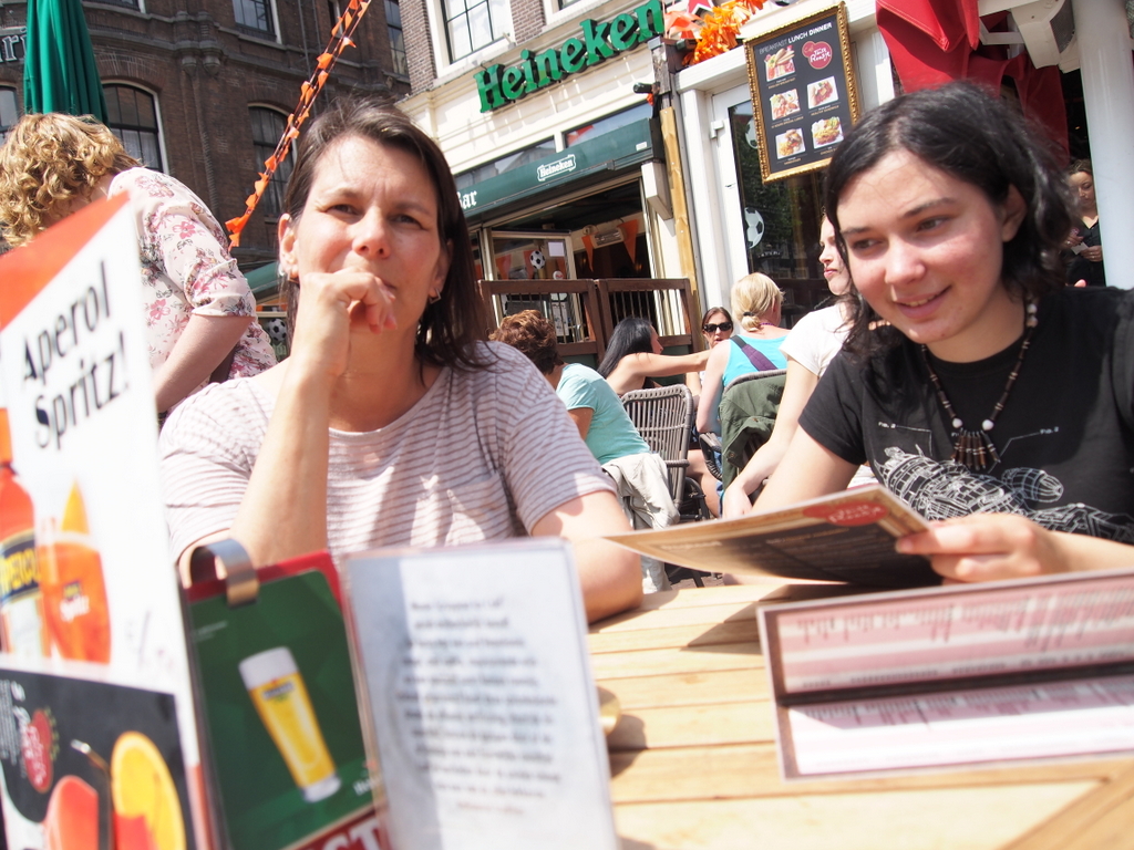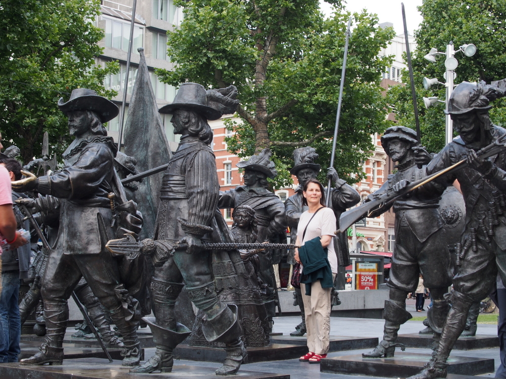 We found it at Café Tante Roosje, on the north edge of the Rembrandtplein, a triangular square (is that a thing?) with life-sized cast sculptures of the figures from “The Night Watch”. No red umbrella, but we had beer and frites and chicken satay while Miranda contented herself with ginger ale and a banana pancake – really a crepe – drizzled with dark chocolate syrup. Out on the curb, something between a mariachi and midwest polka band was playing jazz standards, including an impressive salsa-style rendition of “Blowing in the Wind”.