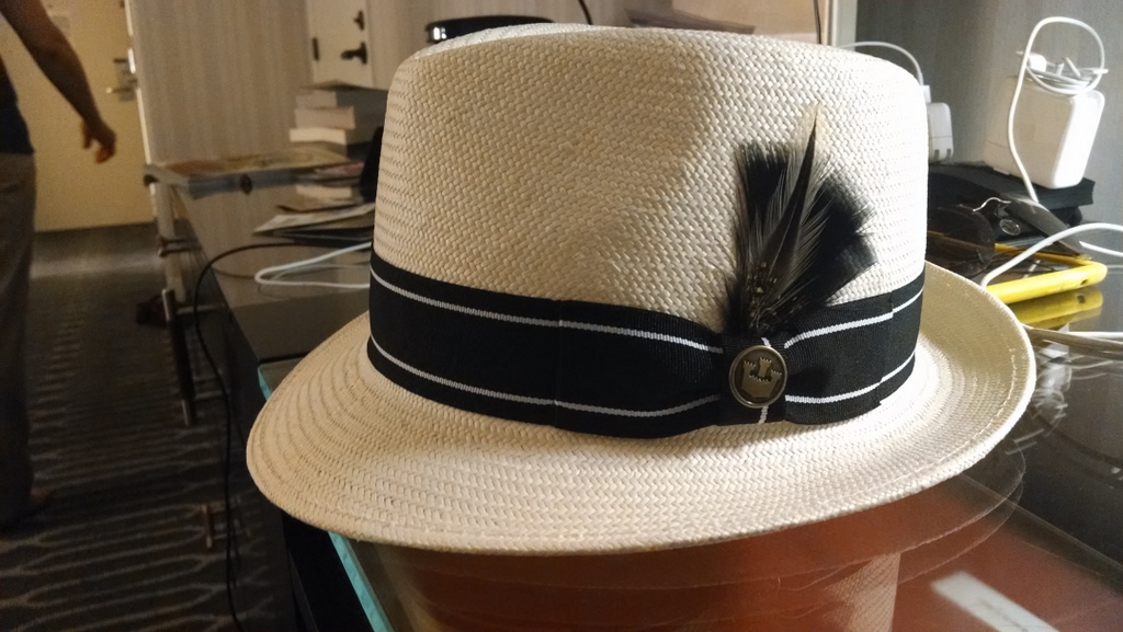Eventually, it was time to get back to the hotel. Jem had called from the room saying he was hungry again (what is it with teenage boys?), and we’d been out on our feet all day. Devon had been steering me toward a summer hat to alternate with my traditional brown waxcloth fedora, and, after a bunch of back-and-forth (crease top or teardrop? narrow or wide brim?) we settled on a winner: a basic medium-brim, teardrop white straw Panama called “The Churchill”. Eric selected a plume from the countertop jar to customize the purchase; we shook hands all around, paid for our purchase, thanked the musician and headed home.