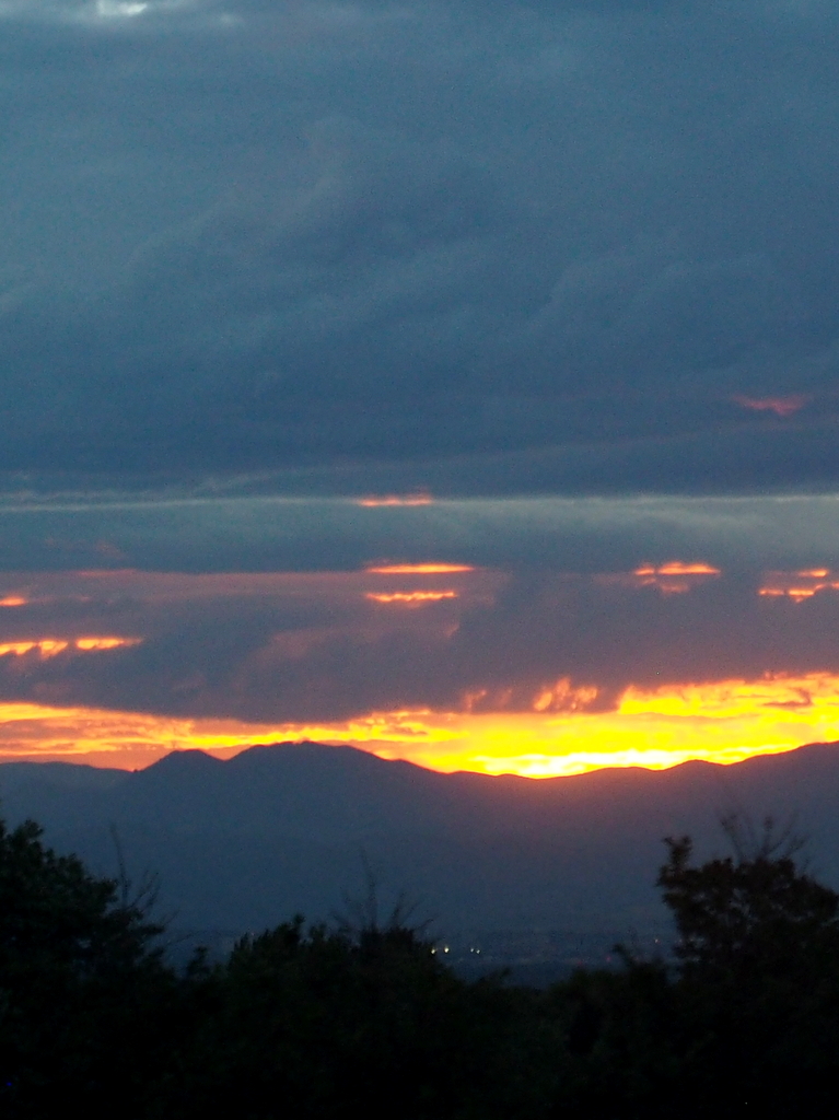 OLYMPUS DIGITAL CAMERAThe idea of rain hadn’t fully formed in my mind until it I was already half soaked by the thick wet barrage coming in sideways through the open window. I’d been stopped at a light, westbound on Arapahoe Road, admiring the crazy glorious colors in the western sky as sunbeams carved their way through towering clouds over the front range. There was a flash bright enough to be visible in the still-broad daylight, followed so closely by a sharp crack that I didn’t even have time to think about beginning to count the nearly obligatory one-one-thousand two-one-thousand. And by the time I’d had the presence of mind to realize that yes, that was thunder, the heavenly fusillade was already on its way.