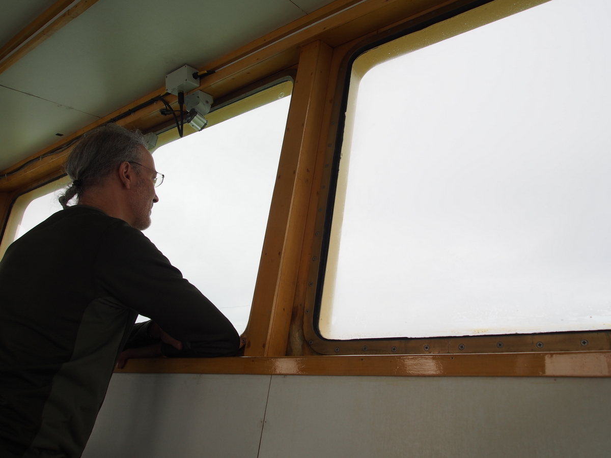 It’s now broad daylight, a little after noon, and I’m completely wiped. With Sean at the helm in the lab, I retreat upstairs, first to the bridge, then higher, to the ice tower, three narrow, enclosed ladders further up.