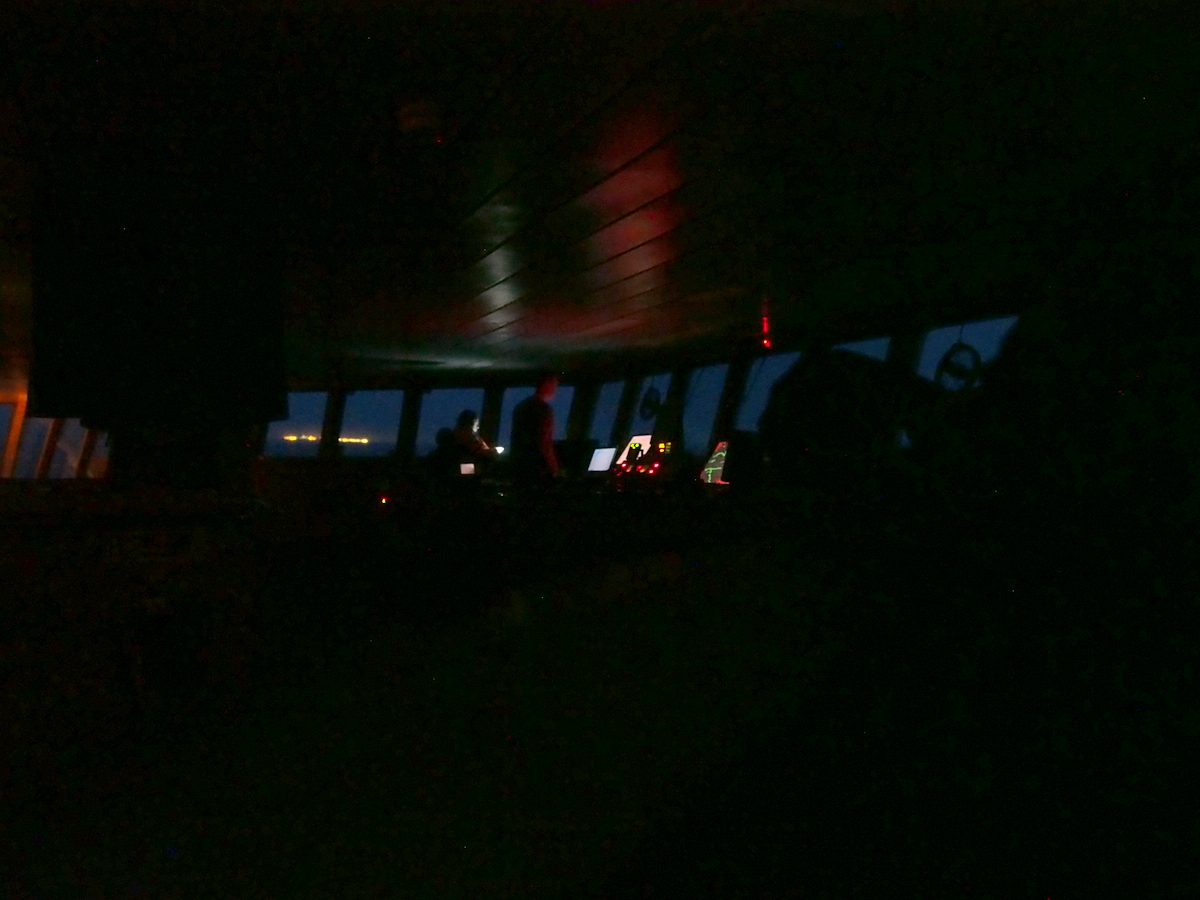 A voice beckons from the darkness; Chris Peterson, the NBP’s Chief Mate is on duty, and he sounds glad to have company. We know Chris has years of experience – you don’t get to be Chief Mate on a ship like the NBP without it – but it’s hard to shake the impression that he’s not much older than my kids.