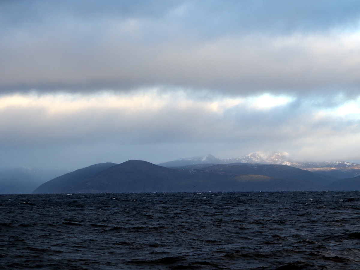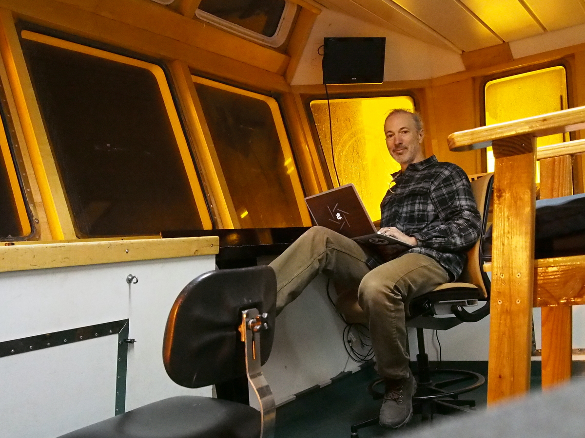 When I do need to be sitting and can get away from my desk, I’ve been retreating to the aft control room. It’s a largish greenhouse overlooking the aft deck and ship’s main winches. If the bridge resembles something out of Star Trek, the aft control room comes closer to the TARDIS, or a 1990’s game controller run amok. But when we’re not running trawls off the a-frame winch in back or loading stuff in port, aft control seems to be a quiet place from which you can watch the world go by. Having a broad horizon to stare out at certainly helps with the seasickness, and when my stomach’s feeling settled, I can even manage to write a little, assuming I remember to do it in short bursts.