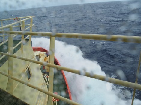 When I’m not lying very still (sometimes in improbable places) with my eyes closed, I’ve found I do best peering out from the bridge or in the aft control room. Captain seems to understand, and appreciates my resignation about why I’m there. He’s not a man of many words but he throws me a bone. “Yeah, you guys having to sit there below all day staring at an itty bitty screen – that would mess anyone up.” He prescribes getting up and moving around, at least once an hour, especially to get out in the wind and weather for fresh air, even if only for a minute. And it’s been working, to an extent.