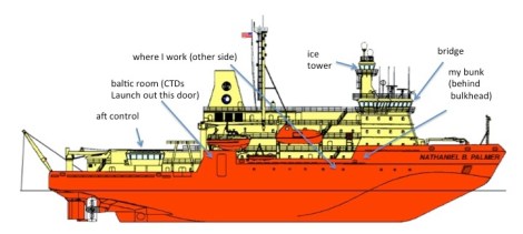 I’m including a diagram below that should give you a rough idea of the size and shape of the ship, as well as the locations of various places I’ve mentioned: the ice tower, aft control, and the elab, where I officially sit.