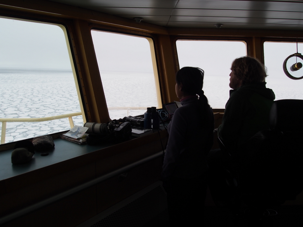 We’ve reached ice! Omigodomigodomigod – we’re driving through ice! It’s only pancake ice, irregular loose disks packed together to give the surface an otherworldly, scaly appearance. But it’s ice, nonetheless. Kim and Barry smile understandingly while I bounce around the galley like a kid who’s just been told that school was canceled on account of snow. They seem to appreciate the enthusiasm of a first-timer, and I’m not on the bridge more than three or four minutes before I see that Kim has followed me upstairs, where we’re getting to be quite a crowd. I guess the “first ice” of any cruise is a special sort of thing.